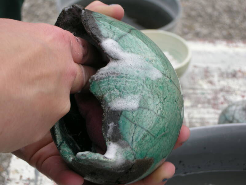 De werkstukken worden roodgloeiend, bij ±1000 graden met tangen uit de oven gehaald. Door deze enorme temperatuurschok ‘barst’ het glazuur wat zorgt voor het typische craquelé effect van raku. Het werk gaat dan in een zaagselton waar de ongeglazuurde delen en barstjes zwart worden ingerookt.